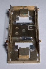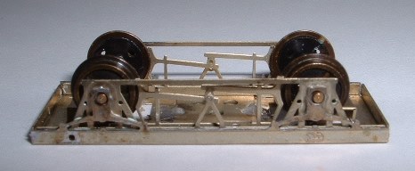 Photo 7. W-irons folded from floor, brake etch soldered to floor. Bearings fitted to W-irons. The folded boxes at the ends are to support DG couplings.