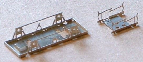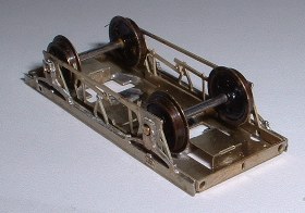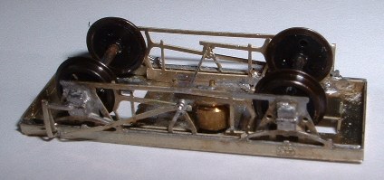 Photo 4. W-iron and buffer beam folded from floor. Brake components folded to shape. Note tab on brake gear floor to support vaccuum cylinder. The brake etch is handed (cam side and non-cam side). To help maintain correct orientation, the tabs which engage in the floor are of different sizes. The rear face of the W irons have recesses in which the wheel bearing sit.
