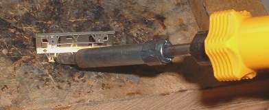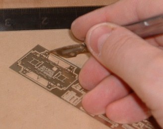 Photo 2. Separating the underframe from the etch with a craft knife on a hard surface. (Use an old but reasonably sharp blade).