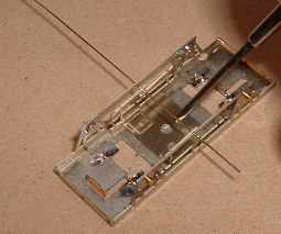 Photo 6. Locating the brake etch with a piece of brass wire to ensure V-hangers and brake gear align, prior to soldering floor of brake gear to floor of wagon.