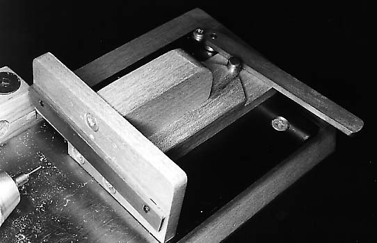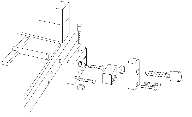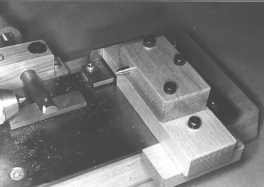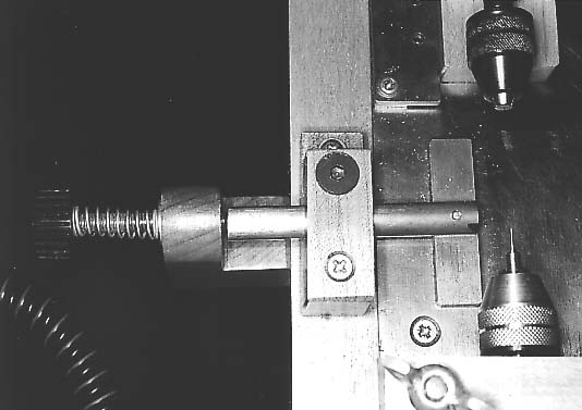 A nut is crushed into the clamping screw block to provide a thread for the clamping screw. The nut is deeply recessed into the block so that the emerging screw thread locks the depth stop bar. The block is shaped to clear the minidrill body and fixed to the rear of the headstock front bearing support with small wood screws. The position of the hole through the front bearing support is shown on figure 13.
