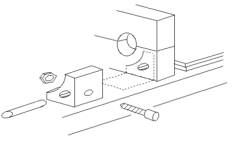 The slide guide and clamp has a M4 counter-sunk screw and nut for the clamping mechanism, and is secured to the lathe base with wood screws. The slide consists of a piece of round bar (about 5mm) and a piece of rectangular bar (about 5mm by 3mm). The rectangular bar is fixed with a small screw to a flat filed on the round bar. The slide is assembled last, and checked for alignment with a test bar. Adjustment of the slide is fiddly - the slide must be removed, tweaked, replaced, rechecked.