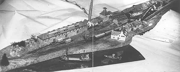 Overall view of Drambuie Junction This picture appears to have been re-photographed from two photographs spliced together and has consequently suffered somewhat in quality, but shows the atmosphere of the layout to good effect. A note on the back of the photo says "the shipping doesn't really belong there".