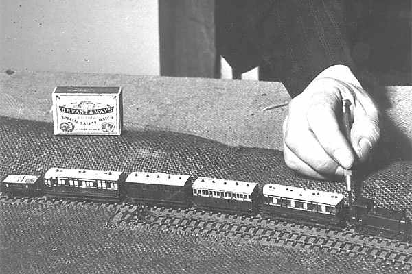 Highland Railway carriages (4 and 6 wheeled varieties) and a Caledonian Railway fish truck coupled to the Stroudley 0-6-0T Dornoch. A note on the back of the photo says "Central Hall, Westminster, c.1949", presumably at the Model Railway Club show.