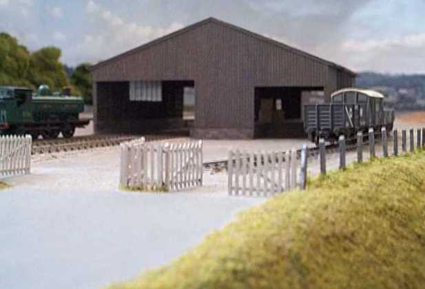 Tavistock goods shed taken from the Launceston end of the station. This was a substantial shed constructed of timber planking on a stone base. It had a small wooden office at the far end and photographs also show a brick office at the near end. This latter office was described as a late addition so I have left it off on the assumption it was built after the period of the model. What I don't know is whether it replaced an earlier office and if so, what that looked like. The model is built of thin (about 1mm) 5 ply obtained many years ago from a model aircraft shop in the UK, scribed at 1.5mm intervals. I feel nothing looks quite as good as wood for representing wood and the ply has a really fine grain to it. Although not really visible in the photograph, internal framing has been included, built using thin square wood sections. There is a small crane on the shed deck, built from a Langley kit. The white fencing is built from various size Evergreen plastic strips. The post and wire fencing is made using dolls hair for the wire, stretched taught between two nails which have been filed to a square section. Intermediate posts are 1mm square plastic section. All is fixed together with super glue. The fence is made on the workbench in sections about 20cm long, painted and then fixed to the layout in predrilled holes - those for the end nails are a tight fit so as to stretch the fence, the intermediate holes are sloppy so that the plastic posts just hang in them until the wood glue dries. Still to be modelled in this photograph is a yard crane and water tower outside the goods shed and the footbridge and station building etc behind the shed.