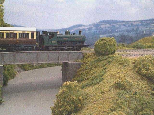 The approach to Tavistock from the Launceston end crosses over a the Whitchurch Downs road as it climbs up from the bridge over the river in the centre of Tavistock. The model bridge uses Peco girders sprayed with a grey car undercoat paint and then dry brushed with grime and rust. The pillars are embossed plastic with the stones individually painted and then the whole thing toned down with a dirty wash to fill the morter coarses. The hardest part to do at this end of the station was the point actuating mechanism because the toe of the first point is actually on the bridge. I use film strip tie bars and for this point, the mechanism is hidden within the hollow right hand bridge pillar. Its a bugger to get at from underneath if it needs adjusting! As with photograph 3, scenic treatment uses various materials from the Woodland Scenics range. This picture gives a good view of the photographic backdrop which I borrowed for the purposes of the photograph. These are being produced by a small one man business here in Perth and were featured in the new products section of the Railway Modeller a few months ago.